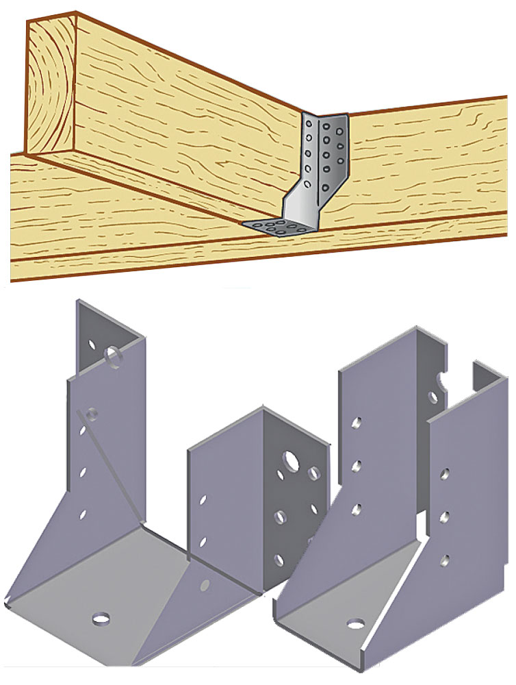 Если балки и лаги пола невидимы в интерьере, то их можно соединять с помощью так называемых балочных башмаков, выпускаемых, например, компанией Essve. Эти элементы подходят для крепления дерева не только к дереву, но и к бетону или кирпичной кладке (при использовании соответствующих ). Они изготавливаются в основном из горячеоцинкованной стали толщиной 1,5 или 2 мм, но есть на рынке и более дорогие изделия из нержавеющей кислотоустойчивой стали А4. Башмаки выпускаются в двух вариантах: с отворотами, повёрнутыми наружу или внутрь. Цена: от 50 до 500 руб. за 1 шт.