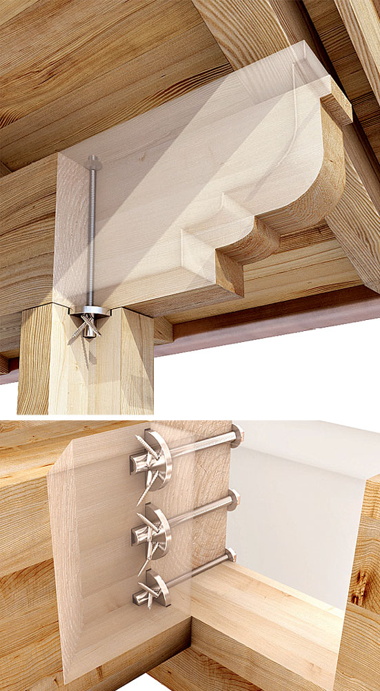 Шпильки и болты устанавливаются через сквозное отверстие, которое должно быть просверлено в каждой из скрепляемых деталей. Непосредственная фиксация осуществляется посредством закручивания гаек. Крупные шайбы позволяют увеличить опорную площадь и предотвратить погружение гаек/головок в древесину.
