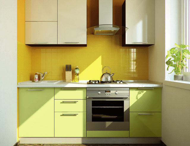 • Яркие жёлтые и оранжевые тона (песочный, персиковый, абрикосовый) станут отличным вариантом для «соседства» с фисташковым в просторном кухонном помещении.