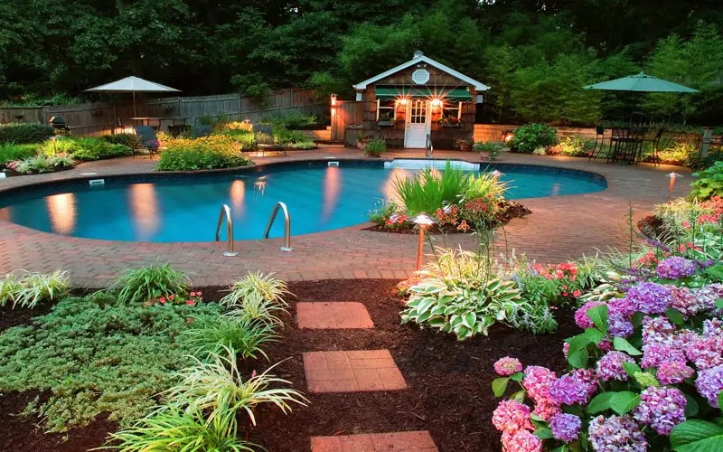 В качестве украшения можно использовать клумбы с цветущими растениями. Вертикальное или на искусственных перголах скроет зону отдыха от посторонних глаз.