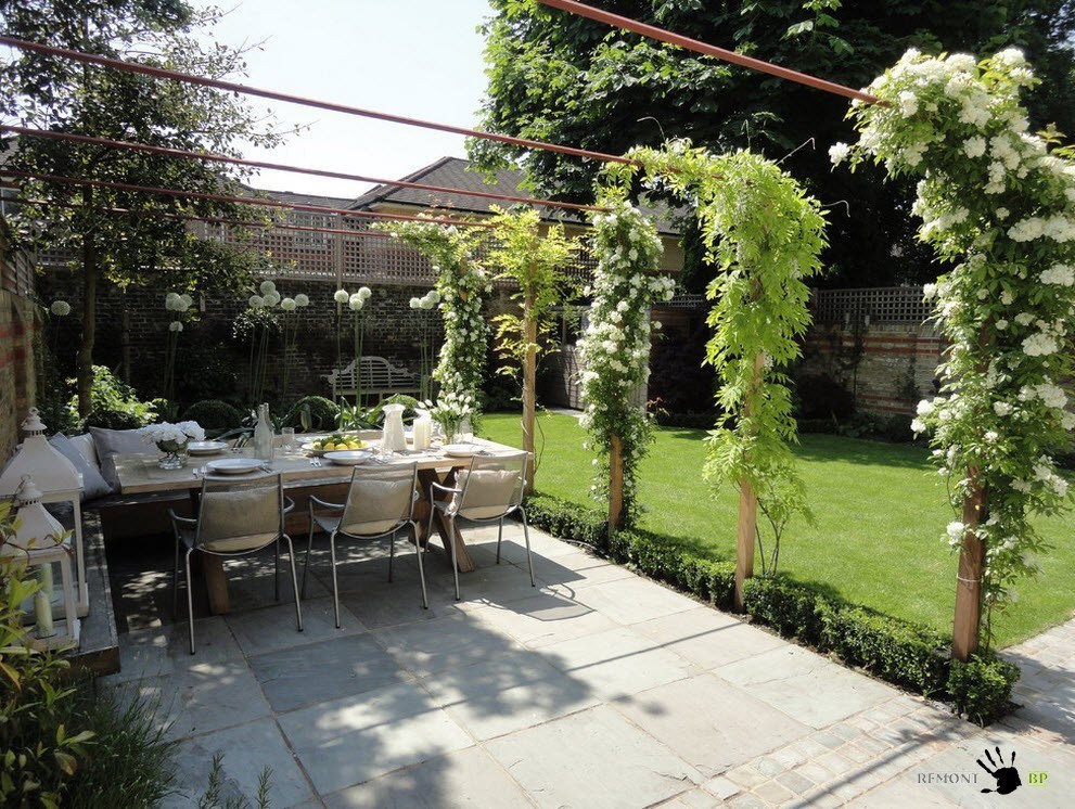 Задний двор лучше оформить как место для отдыха, установив там скамейки или для утреннего чаепития. Постройки, или виноградом, будут защищать в летний зной или от небольшого дождя. Это станет любимым местом для уединённого отдыха или романтического ужина.