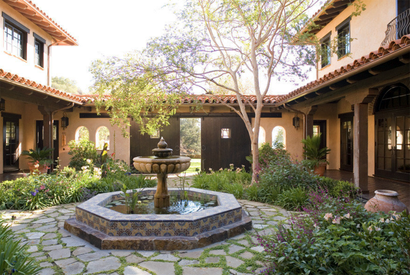 – это обилие солнца, ярких красок, обязательно должна быть устроена зона патио, на которой следует установить плетёную мебель, кованый мангал, а для отдыха гармонично впишутся шезлонги и гамак. Дорожки во дворе частного дома могут быть сделаны из пластушки, дерева или натурального камня в светлых оттенках, фотопримеры представлены в нашей галерее. Прекрасным дополнением оформления участка станут красивые цветочные композиции в керамических кашпо, беседка, увитая зелёными плетущимися растениями, и небольшой фонтанчик.