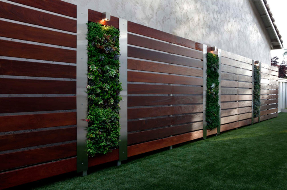 Комбинируя ограждение с вертикальными клумбами можно создать совершенно неповторимый образ границ участка и всей территории в целом. Оригинальные «живые» вставки из зелени и цветов освежат внешний вид даже самого урбанистического по стилю забора.