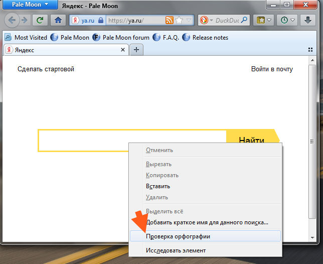 Честно говоря или я не помню или просто нет такой настройки, где можно добавить словарь. Поэтому я предлагаю сделать так, вот открываете любую страницу где есть текстовое поле, я вот например открыл поисковик Яндекс. И нажимаете правой кнопкой по текстовому полю и ставите галочку Проверка орфографии: