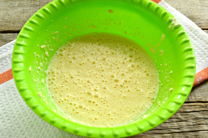 Соединить набухшую манную крупу со второй смесью, туда же выложить лимонное пюре, хорошенько перемешать и взбить получившееся тесто венчиком или вилкой.