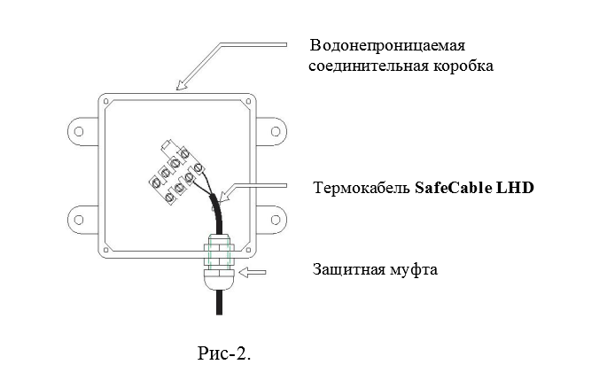 - Самым надежным соединением термокабеля в монтажной коробке является скручивание стальных концов термокабеля в кольца определенного диаметра под винт клемника (см. Рис-3). После чего данную монтажную коробку заливают специальной пластичной мастикой для защиты зажимов клемника от агрессивной среды. Пластичность мастики должна соответствовать климатическим условиям работы. В случае возникновения необходимость ремонта, покрытие из мастики должно легко удаляться из монтажной коробки.