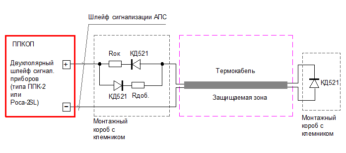 Схема подключения термокабеля в двухполярный одноуровневый шлейф пожарной сигнализации.