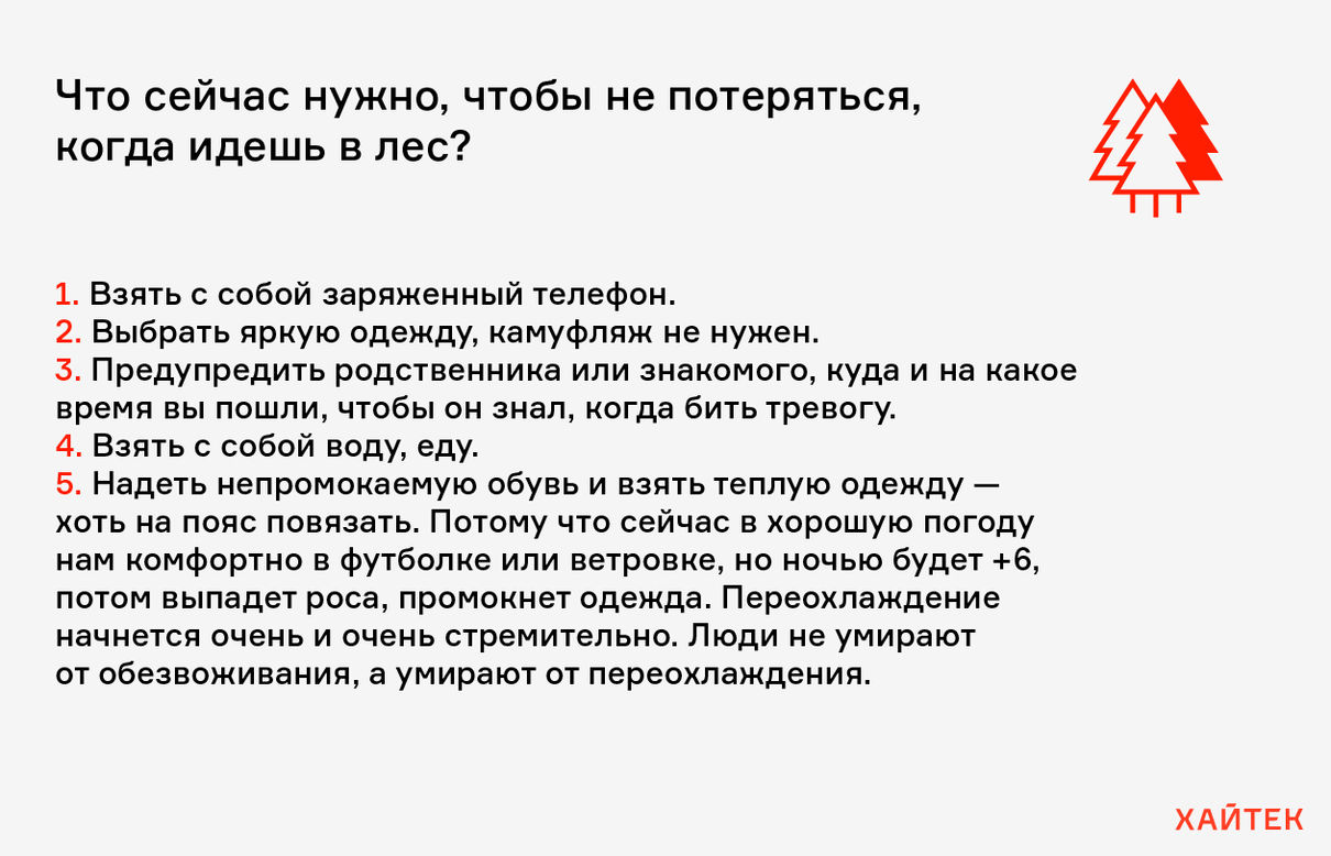 Мой ребенок еще маленький, ему пять лет, но там была информация о том, как, например, собирать детей в лес. Нельзя одеваться в зеленое или коричневое, потому что волонтер может пройти в нескольких метрах от потерявшегося человека и не заметить его. Потом, если человек идет в лес, у него обязательно должен быть с собой какой-нибудь «Сникерс».