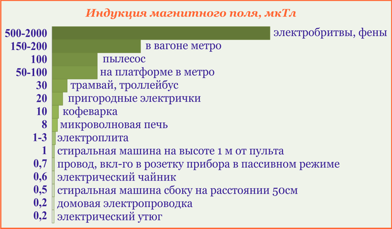 Значения индукции магнитных полей, наиболее часто встречаемых нами в повседневной жизни приведены на диаграмме ниже. Глядя на эту диаграмму становится ясно, что мы подвергаемся воздействию магнитных полей постоянно и повсеместно. По мнению некоторых ученых, вредными считаются магнитные поля с индукцией свыше 0,2 мкТл. Ествественно, что следует предпринимать определенные меры предосторожности, чтобы обезопасить себя от пагубного воздействия окружающих нас полей. Просто выполняя несколько несложных правил Вы можете в значительной мере снизить воздействие магнитных полей на свой организм.