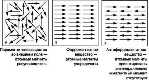 Типы упорядочения магнитных моментов атомов в парамагнитных (а), ферромагнитных (б) и антиферромагнитных (в) веществах. Рисунок с сайта: http://encyclopaedia.biga.ru/enc/science_and_technology/ MAGNITI_I_MAGNITNIE_SVOSTVA_VESHCHESTVA.html