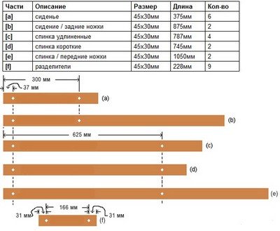 Для изготовления кресла также вполне подойдут бруски размером 50х33 мм, которые можно получить, распилив на три равных части доску 50х100 мм. Общая длина брусков должна составлять 13 метров.