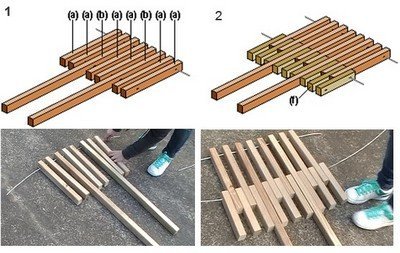 На ровной поверхности согласно схеме выкладываем бруски для обустройства сидения. Через сквозные отверстия пропускам проволоку