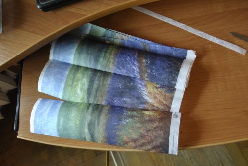 5. Затем нужно измерить ширину секции, расчертить и разрезать рисунок на соответствующие полосы. Приклеиваются они при помощи обычного клея ПВА. Полосы нужно аккуратно разглаживать, удаляя воздушные пузырьки. Когда клей высохнет нужно приступить к завершению рисунка, закрашиванию оставшихся частей ребер, смешивая краски для получения нужного оттенка.