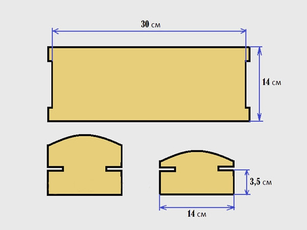 - Сначала необходимо вырезать детали дивана: основание, спинку и нижнюю часть одинакового размера, подлокотники, расширяющиеся вверх. На схеме указаны размеры.