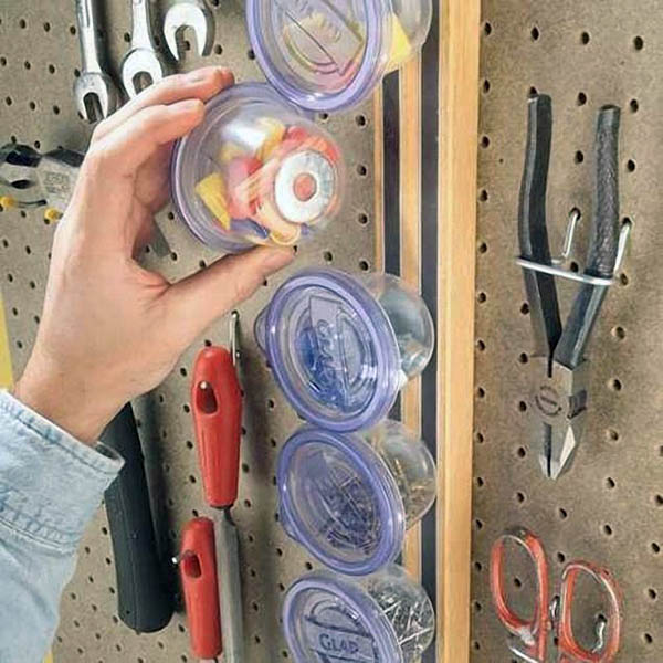 Еще один оригинальный мини-стеллаж для хранения мелочей в гараже изготавливаем из пищевых контейнеров на магните. При помощи супер-клея прикрепляем ко дну контейнера круглый магнит в виде шайбы. К перфорированному экрану крепим деревянную рейку с магнитными полосками. Внутри контейнеров храним винты, гайки, болты, саморезы и другие мелочи, которые валяются в ящике верстака. Подвешиваем коробочки к магниту.