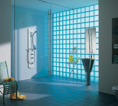 Для перегородок стеклянные блоки также незаменимы. Их них можно выполнить ее любого размера и формы. Она может получиться ступенчатой, закругленной, пирамидообразной, цилиндрической и пр. Стеклоблоки в интерьере ванной чаще всего используют именно для этих целей. Здесь, в окружении воды, они смотрятся наиболее гармонично и естественно. Они хорошо сочетаются с плиткой, сантехникой, не боятся влаги и прекрасно защищают от посторонних глаз интимное пространство. В последнее время стала модной душевая из стеклоблоков. Это гораздо практичнее и безопаснее, чем использование стекла.