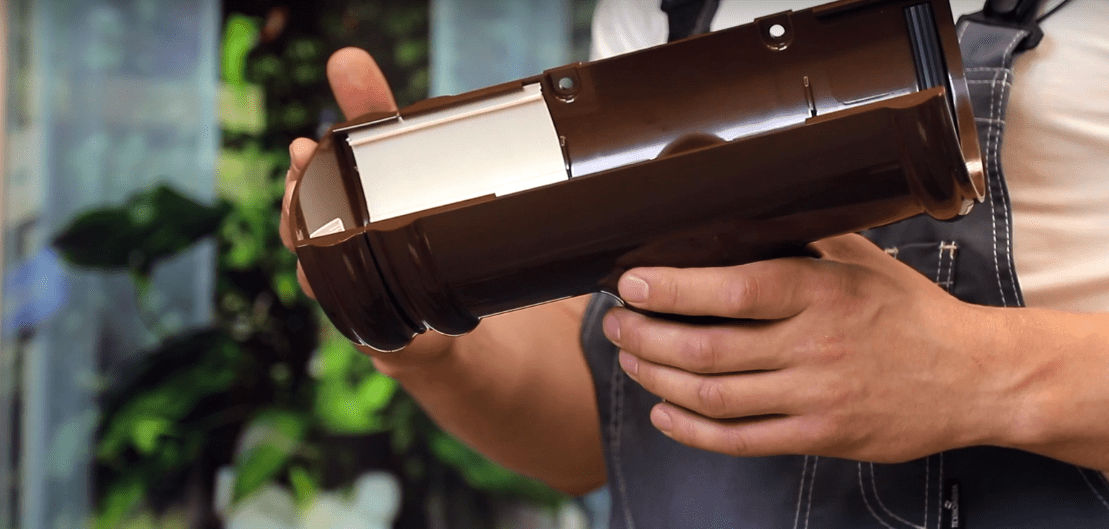 Устанавливаем и соединяем все детали желоба на кронштейны, После прикрепляем заглушки, которые имеем полное право установить и до сборки желобов. На внутренние стороны заглушек перед установкой тоже наносится клеевой состав.