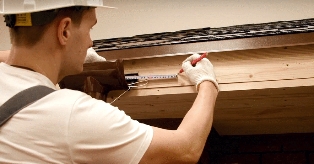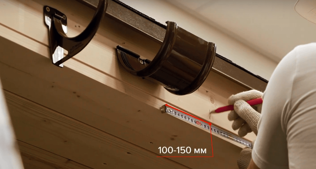 - При установке отдельных держателей, для начала на ветровой доске отбивают прямую линию, соблюдая уклон в пределах трех- пяти мм/пог. м. в направлении сливной воронки. Отступив от кромки торцевой части ветровой доски (отступ примерно равен 50 – 100 мм), отмечают место фиксации первого кронштейна. После этого на всей линии размечают места установки держателей с шагом не более 0,6 м (в отдельных случаях допустим даже больший шаг, что обязательно отмечается в инструкции). Завершив разметку, приступают к монтажу кронштейнов.