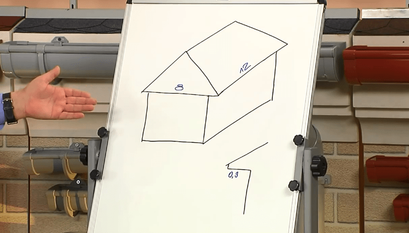 Рассчитывать необходимое количество деталей для сооружения водосточной системы следует в индивидуальном порядке. В частном строительстве сейчас стремятся уйти от типового проектирования, а заодно и от схожих по конструкции крыш. Однако есть расчетный шаблон, который даст представление о выполнении вычислений.