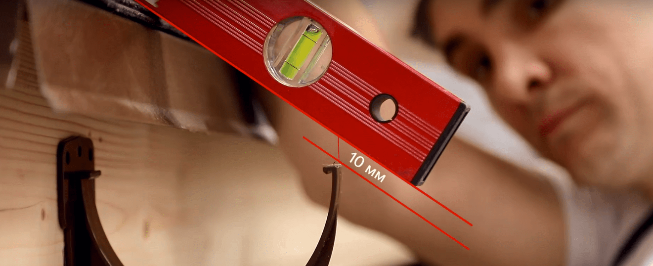 - Соблюдение уклона желобов. В зависимости от марки системы, рекомендованный производителем уклон указывается от 2 до 5 мм, распределенных на 1 погонный м водоприемного желоба. Уклон формируется в сторону водосборной воронки путем установки кронштейнов со смещением по высоте.