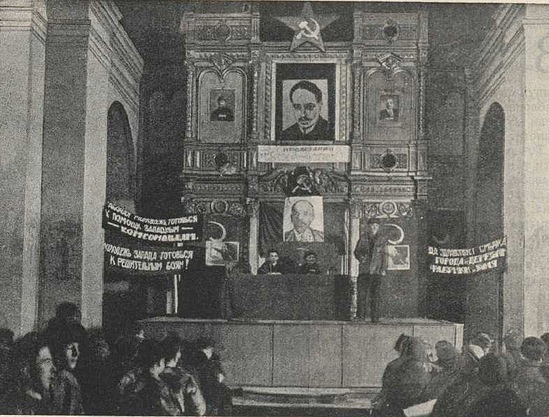 Сверху мелким шрифтом: По ходатайству рабочих мыльного завода «Новая Заря» церковь по Б.Серпуховке отведена под клуб.
