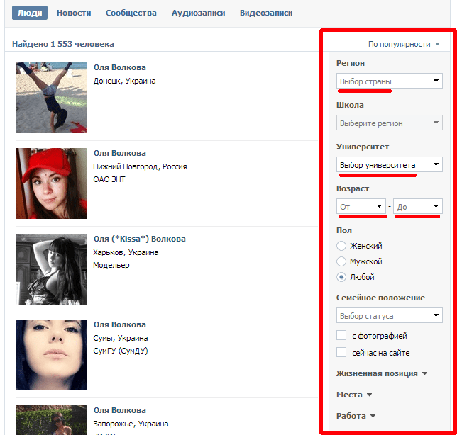 Поиск людей ВКонтакте по месту работы, учебы, военной службе, интересам и т.п.