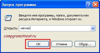 Рис. 10. Ввод команды Winver для Windows XP