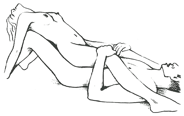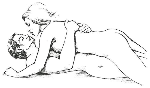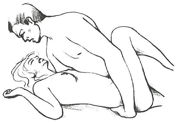Женщина лежит на боку, руки над головой. Мужчина тоже лежит на боку перпендикулярно партнерше. Она поднимает верхнюю ногу, и он может устроиться между ее бедер. Он держит ее за плечи, чтобы было удобнее двигаться.