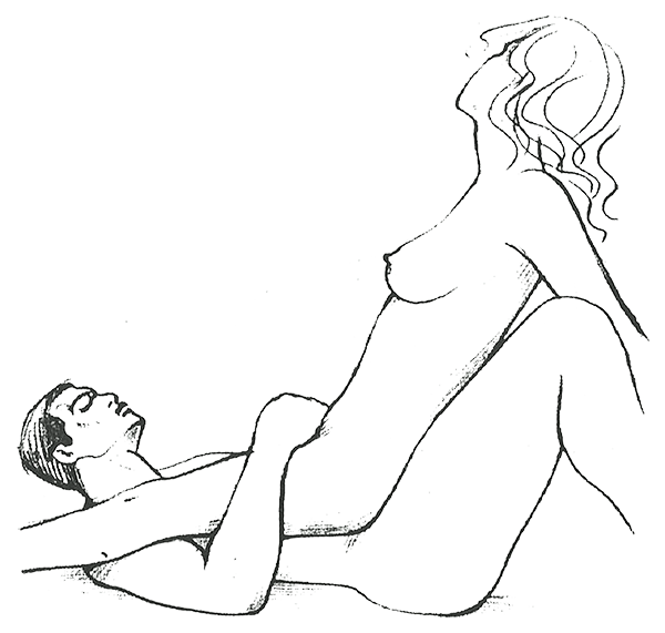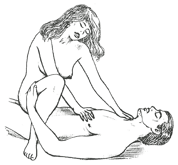 Женщина садится сверху, упираясь подошвами в кровать, наклоняется назад и переносит вес на вытянутые руки. Так она и ездит на своем партнере, пока не наездится. А потом она может опереться руками на его торс и уже сесть на колени — превращение! И при этом она двигает его так, чтобы его голова и руки очутились на полу. Короче, требуется техника.