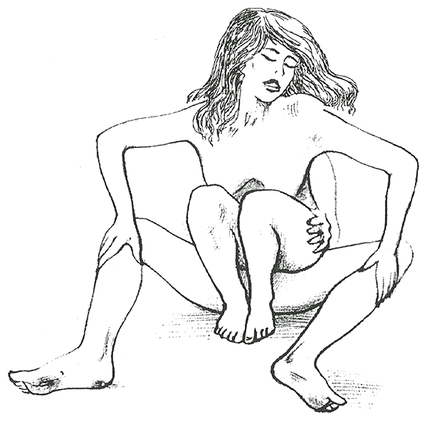 Женщина ложится на бок на кровать или на пол и вытягивает ноги под углом 90 градусов перед собой. Получается такая форма буквы L.