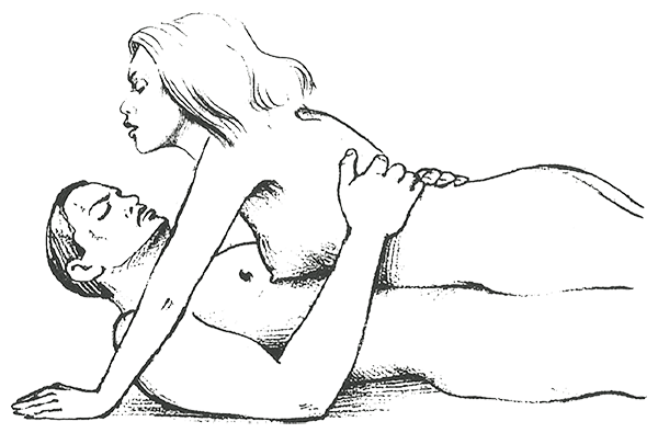 Мужчина лежит на спине, вытянув и слегка раздвинув ноги и положив голову на подушку. Женщина садится сверху так, что ее ноги оказываются по одну сторону от его туловища. А еще она облокачивается на руки и вот таким образом двигается.