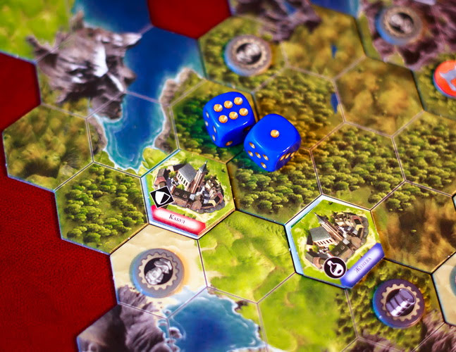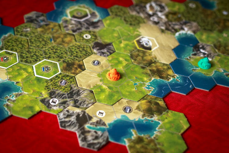 Поле собирается из фрагментов, поэтому у игроков будет возможность перед партией собирать каждый раз новую карту. Это, конечно же, большой плюс, т.к. перед игрой никто из игроков не знает, с чем ему предстоит встретиться на карте. Может быть возле вашей столицы будет находится чудо природы, а может пристанище варваров или город-государство. Может быть ваша столица окажется в центре карты, а может и на ее краю.