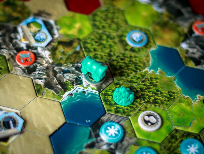 Давайте подробнее остановимся на стартовых картах действий, на примере которых я объясню эффективность розыгрыша карты в том или ином положении в ряду. Каждая карта действий отвечает за конкретный тип действий. Культура позволяет класть на соседние с городом клетки жетоны контроля, присоединяя новую территорию и захватывая ценные ресурсы (чем выше номер карты, тем более сложные гексы можно захватывать). Наука увеличивает значение счетчика технологий игрока; при достижении определенных уровней, можно получать новые карты действий, которые выкладываются взамен старых (новые карты технологий более крутые, чем старые); чем выше номер карты, тем больше очков технологии получает игрок. Экономика позволяет двигать миньки караванов в города-государства и города других игроков, зарабатывая при этом ценные жетоны торговли и получая карты дипломатии (чем выше номер карты, тем более сложные местности может проходить караван). С помощью ремесла строят новые города или чудеса света, дающие ценные бонусы (чем выше номер карты, тем больше очков может потратить игрок на новое чудо света). Война либо усиливает жетоны контроля игрока, либо позволяет атаковать варваров, города-государства или чужие жетоны контроля (чем выше номер карты, тем больше показатель боевой силы игрока).