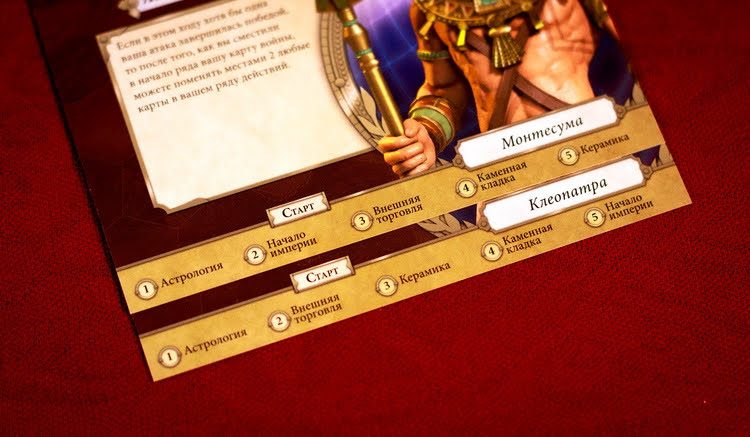 В качестве разнообразия игра может предложить разные фрагменты игрового поля, разные карты целей и разные планшеты предводителей. Что я могу сказать о предводителях? В игре их всего 8 штук. Предводители отличаются стартовой раскладкой карт действий и уникальным свойством. Разные стартовые раскладки карт нужны для того, чтобы действия игроков отличались друг от друга с самого старта. Уникальное свойство позволяет игроку делать что-то более эффективно. Например, давать бонус против варваров, двигать караваны из любого своего города, давать бонус к постройке чудес света, уменьшать требования к строительству городов и выставлению жетонов контроля. Честно говоря, некоторые свойства предводителей мне кажутся интереснее других, поэтому перед игрой я бы все-таки их драфтил, а не раздавал случайным образом.