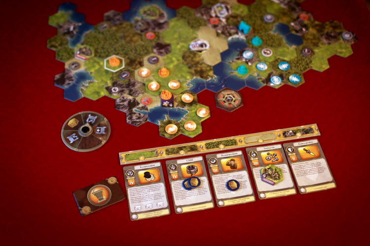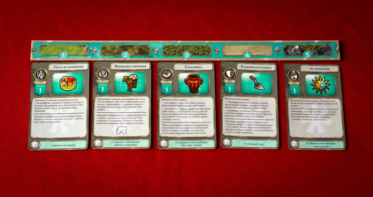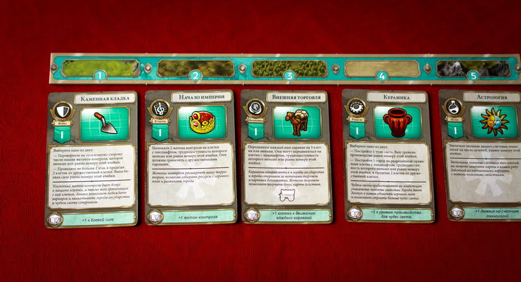 Давайте подробнее остановимся на стартовых картах действий, на примере которых я объясню эффективность розыгрыша карты в том или ином положении в ряду. Каждая карта действий отвечает за конкретный тип действий. Культура позволяет класть на соседние с городом клетки жетоны контроля, присоединяя новую территорию и захватывая ценные ресурсы (чем выше номер карты, тем более сложные гексы можно захватывать). Наука увеличивает значение счетчика технологий игрока; при достижении определенных уровней, можно получать новые карты действий, которые выкладываются взамен старых (новые карты технологий более крутые, чем старые); чем выше номер карты, тем больше очков технологии получает игрок. Экономика позволяет двигать миньки караванов в города-государства и города других игроков, зарабатывая при этом ценные жетоны торговли и получая карты дипломатии (чем выше номер карты, тем более сложные местности может проходить караван). С помощью ремесла строят новые города или чудеса света, дающие ценные бонусы (чем выше номер карты, тем больше очков может потратить игрок на новое чудо света). Война либо усиливает жетоны контроля игрока, либо позволяет атаковать варваров, города-государства или чужие жетоны контроля (чем выше номер карты, тем больше показатель боевой силы игрока).