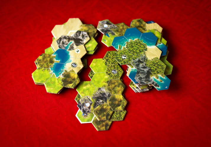 Игровое поле собирается из разных небольших фрагментов. У каждого игрока будет по 3 таких фрагмента. Разложив по очереди все части поля на столе, у вас получится один большой кусок единственной и неповторимой земли, поделенной на гексы. Одна клетка (гекс) соответствует одному из шести видов ландшафта — равнины, холмы, леса, пустыни, горы и вода. Гекс со звездочкой означает место для столицы одного из игроков, с которого нужно начинать завоевание мира.
