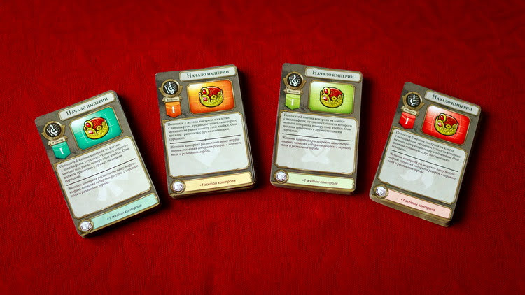 Какие могут быть нюансы при этом? Чем дальше находится карта в ряду, тем эффективнее ее можно разыграть. Например, если взять карту с пятой позиции (горы), то это значит, что вам будет подконтрольна любая местность от равнин до гор (кроме воды). А если взять карту с первой позиции (равнины), то эффект карты будет значительно ослаблен возможностями.