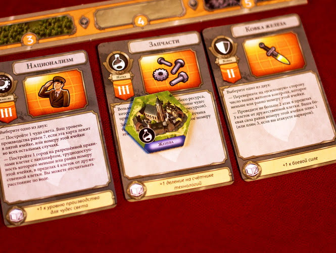 Практически любой апгрейд одного из видов карты ведет к тому, что вы становитесь сильнее. Сыграв 4 партии, я так и не выбрал для себя оптимальный путь развития технологий. Разве что ближе к концу игры реже использую караваны, потому что у меня и так обычно полно жетонов торговли. Каждый игрок сам решает, что ему нужно быстрее развить. Каждый новый уровень карты оставляет прежние умения и добавляет новые. Вы сможете захватывать больше гексов, усилить боевую силу, получать больше жетонов торговли или ресурсов, вы будете легче получать карты чудес света и т.д.