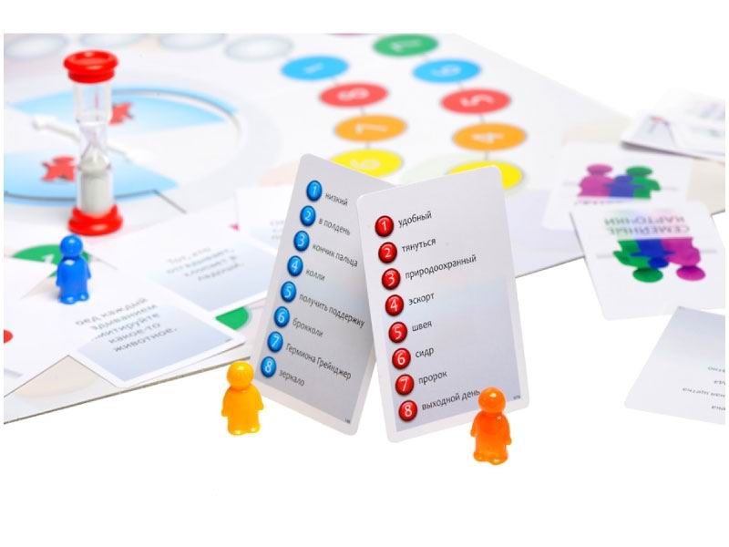 «Скажи иначе» — вот и вся суть игры, описанная еще в названии. Сначала игроки делятся на команды, далее, жеребьевкой, определяют последовательность хода и расставляются все фишки на старте. Игрок первой команды вслепую выбирает себе карточки со словами, противники называют число от 1 до 8 — именно слова под этим номером игроку и нужно будет объяснять своей команде « иначе» . Одновременно переворачиваются песочные часы — за эту минутку игрок должен пояснить как можно больше слов.