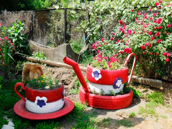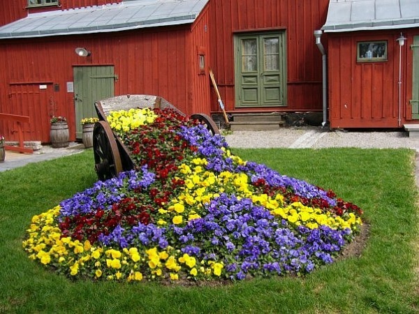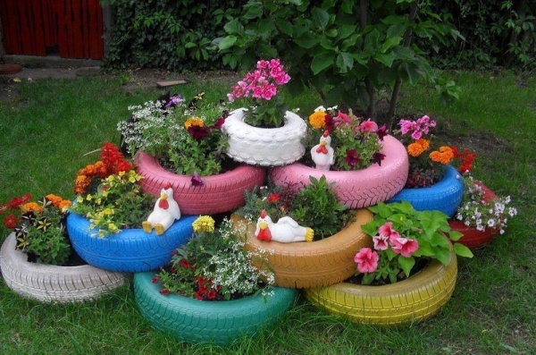 Начните с цветников. Специалисты советуют разбить клумбы по бокам от входа. Только не стоит делать их симметричными. Для оформления цветников можно использовать буквально все, что есть в хозяйстве.