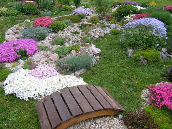 Обыгрываются имеющиеся неровности рельефа или своими руками создается мини-рельеф в одной-двух зонах. Это может быть маленький водоем с горбатым мостиком, подпорная стенка, альпийская горка. Не хотите заниматься земляными работами? Создайте объем, устроив цветник с растениями разной формы, окраски и высоты. Решение простое, а выглядеть цветник будет потрясающе.