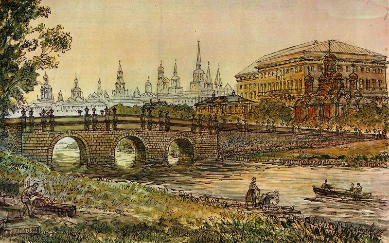 Вид Каменного Моста в Москве с деревянным мостиком у Водовзводной башни. Нач. 1800-х гг. Гравюра Г. Лари по рисунку Ж. Делабарта 1796 г. На первом плане устье Неглинки