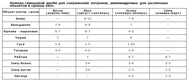 Разница так же составит два пункта между летним и осенним, а также осенним и зимним периодами. Причина в том, что зимой животные начинают утепляться, а для попадания в цель через уплотненные шерсть или надкожный слой понадобятся крупные дробины.