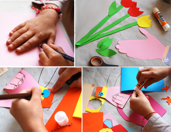 Ребенку обязательно понравится идея обвести собственную ладошку, вырезать получившийся силуэт и из него сделать маме открытку.