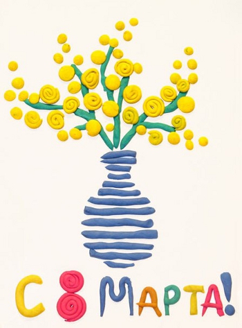 Вот пример еще одной интересной открытки на 8 марта, выполненной из пластилина в технике аппликация.