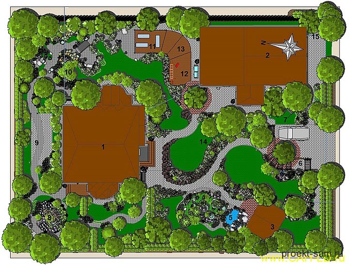 Задуманный образ участка с плодовым садом, клумбами и цветниками невозможно создать без тщательного планирования посадок. Именно этим в первую очередь и занимается ландшафтный дизайнер, когда составляет дендроплан участка – чертеж, на который наносятся контуры всех зеленых насаждений в момент их наибольшего роста. Кроме того, на нем изображаются границы участка, функциональные зоны, дом, хозяйственные постройки и дорожки. Это необходимо, чтобы осуществить привязку растений на чертеже к жестким линиям и твердым покрытиям.
