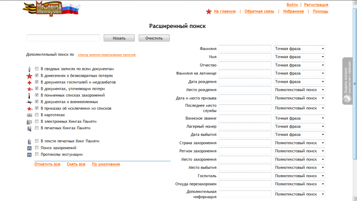Главное правило при осуществлении запросов: если вы не нашли того, кого искали, это не значит, что информация в ОБД отсутствует. Возможно, надо просто поискать по-другому. Причин, по которым имеющаяся запись не находится при вводе абсолютно точной информации, несколько. Во-первых, в документе могут быть не заполнены некоторые поля. Например, не указан год рождения. В этом случае, при указании года рождения в запросе запись найдена не будет. То же самое произойдет, если в запросе указана точная дата рождения, которая отсутствует в большинстве документов. Чаще всего, если и есть, то только год, без месяца и даты. Во-вторых, в документе информация может быть сокращена. Чаще всего это касается имен и отчеств. Могут быть как собственно сокращения, причем не только от начала слова (например, возможно сокращение «Алек-вич», и поди разбери, Александрович или Алексеевич имелся в виду), так и указание инициалов или отсутствие отчества. В третьих, в документах имеются многочисленные ошибки, допущенные писарями, которые часто либо были малограмотными, либо писали на слух. И наконец, могли появиться ошибки, допущенные при заполнении полей операторами. Хотя при обработке осуществлялись многократные автоматические и ручные проверки вводимой информации, при обработке огромных объемов за короткие сроки ошибки неизбежны. К тому же зачастую просто невозможно разобраться в почерке писаря или документ имеет дефекты, не позволяющие правильно заполнить поле. Все эти факторы необходимо учитывать, формируя запросы. Самый простой вариант — набрать все слова для поиска в общей строке. Но не удивляйтесь, если при этом в результатах запроса появятся лишние записи. Дело в том, что слова из общей строки ищутся во всех полях записи, поэтому если, например, в общей строке имеется слово Александров или Львов, будут найдены записи как людей с такой фамилией, так и уроженцев этих городов, призванных из них или похороненных в них. Слова с множественными значениями лучше вводить в запросе не в общую строку, а в специализированные поля. Набор этих полей зависит от того, в документах каких типов информации ищутся записи. И показываются для возможного заполнения только те поля, которые актуальны хотя бы для одного из помеченных для поиска типов. Действительно, в документах о военнопленных, например, никогда не указано, откуда человек призван (нацистов это не интересовало), в списках захороненных, приложенных к паспортам захоронений, нет информации не только о месте призыва, но и о месте рождения, и т.д. По умолчанию, поиск ведется среди всех типов документов, связанных с изображениями, кроме «Книг Памяти». Это обусловлено тем, что записи из «Книг Памяти», как правило, показываются первыми, и при их большом количестве в результатах поиска добраться до записей из архивных документов бывает затруднительно. Поэтому, если записи из «Книг Памяти» требуется включить в результаты поиска, это надо указывать явно перед осуществлением первого запроса с их участием. Если в запросе часть слов указано в общей строке, а часть — в специализированных полях, учитываются все элементы запроса, причем слова, набранные в общей строке, ищутся во всех полях записи, а слова, набранные в полях — только в этих полях записи. В результат запроса попадают записи, удовлетворяющие всем критериям поиск