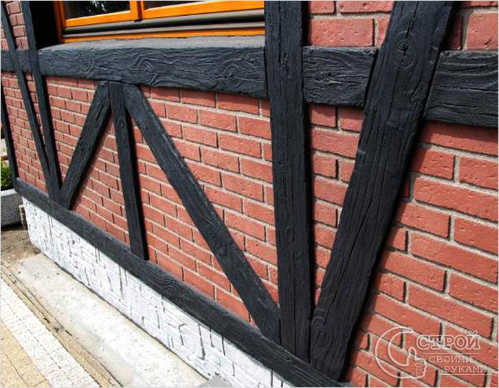 Совет. Имитация фахверка не требует точного соблюдения этих условий, ведь никакой нагрузке фальшбалки не подвергаются. В то же время, грамотно расположенные элементы создают более правдоподобный вид и приближают отделку к настоящему немецкому стилю.