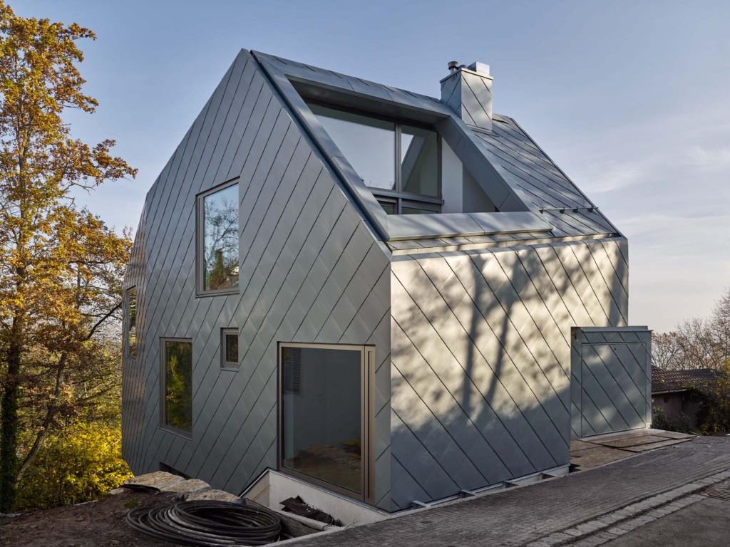 В архитектуре частного дома объединились традиционные и современные элементы : простая форма здания и двускатная крыша предстали в новом прочтении, а давно известное в строительстве цинковое кровельное покрытие распространилось на всю поверхность дома. Klaus Schlossen Architekten
