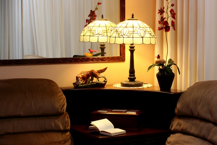 Для освещения интерьера немецких домов также рекомендуют использовать теплый свет. В центральных комнатах должно быть больше светильников. Для интимной атмосферы подходят спальни и читальные зоны, где будет достаточно настенных бра и точечного света. Яркими пятнами в интерьере могут быть витражи. Не обязательно ими декорировать окна дома. Настольные лампы, столешницы и кухонные шкафчики тоже можно украсить цветными стеклышками.